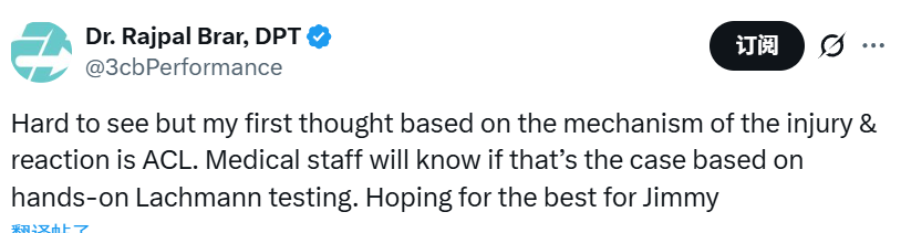 医学专家Brar写道:“虽然看得不太真切,但从受伤动作和他的反应来判断,我第一反应是前交叉韧带(ACL)损伤。队医通过徒手拉克曼试验,就能确诊伤情。真心为吉米祈祷,希望他能逢凶化吉。”